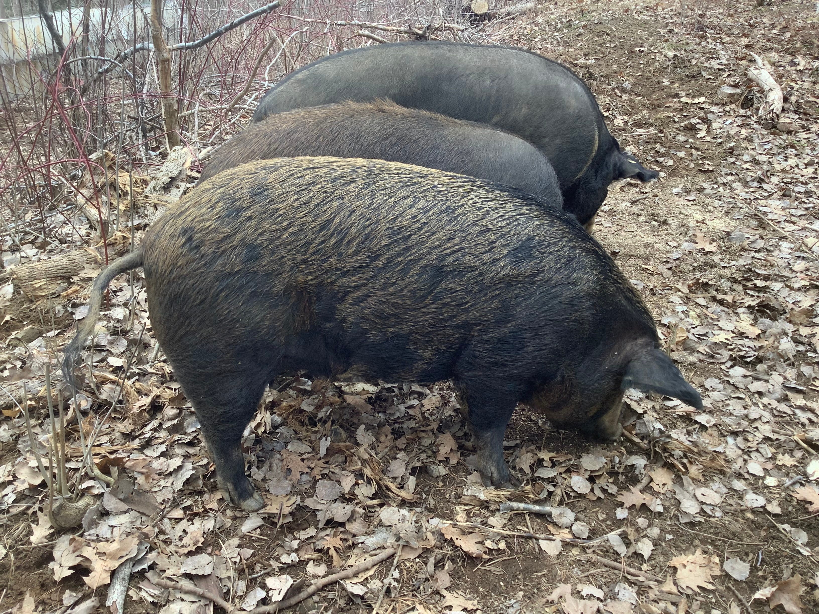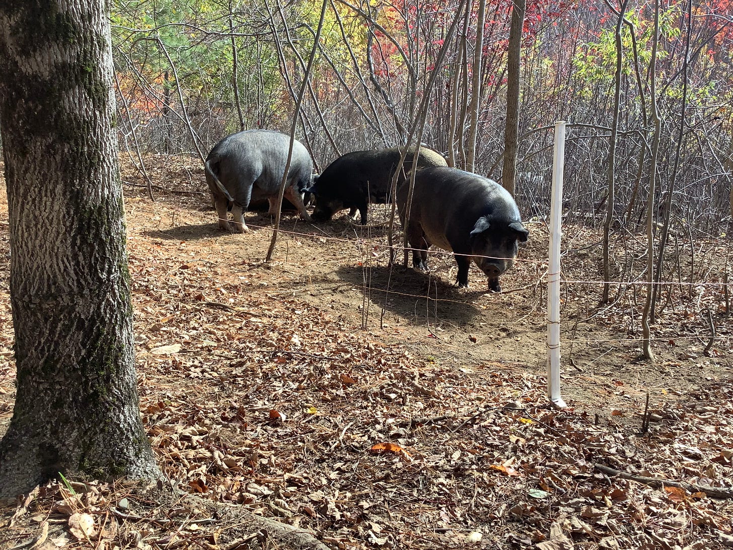 A woodland pasture—a mix of open space, forest edge, and tree cover—gives pigs the closest thing to their natural habitat.